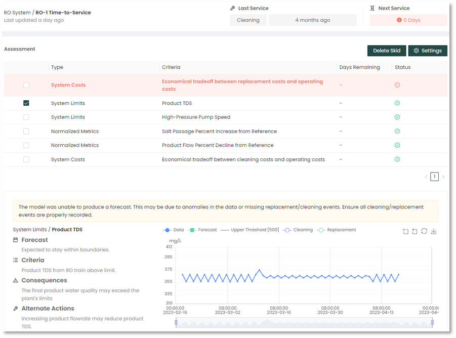 The Pani ZED™ Forecasting feature is a service prediction tool that informs the user and the operations team when service is required for a particular asset, such as membranes in a Reverse Osmosis (RO) skid. This includes membrane cleaning and replacement, and helps to recommend the Time-to-Service (TTS).