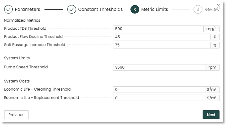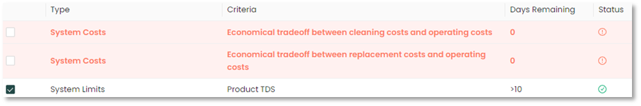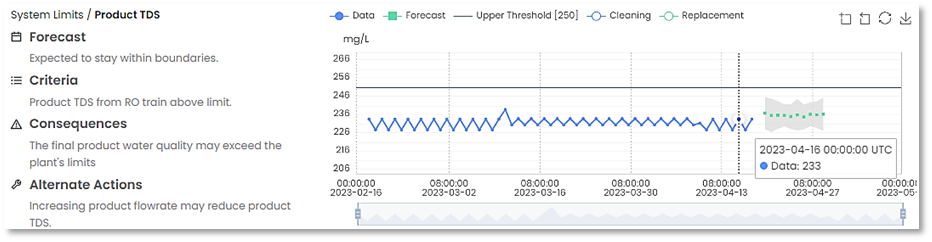 The graph below includes a trend line estimating when a particular threshold will cross the performance threshold and a membrane servicing will be required. It also provides alternative actions if the user decides not to proceed with the servicing.