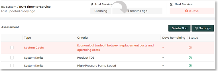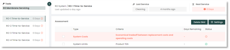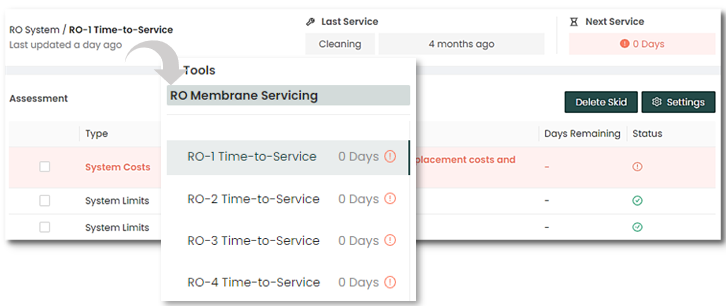 Once an RO train is selected (in this case, RO-1 Time-To-Service), the top of the screen will show the type of membrane service and how many days ago it was performed. It will also indicate when the next membrane service is due.
