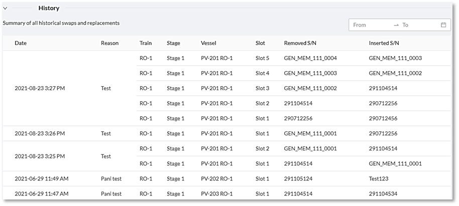 You can view a historical summary of membrane swaps and replacements by clicking on the pull-down tab as shown above. You can configure the number of entries per page, as well as scroll through the summary pages.