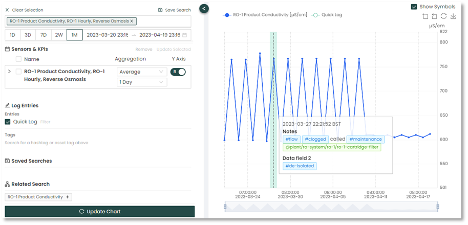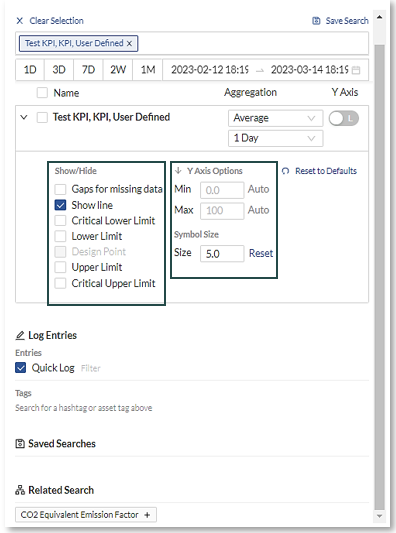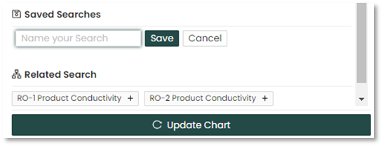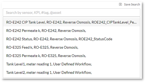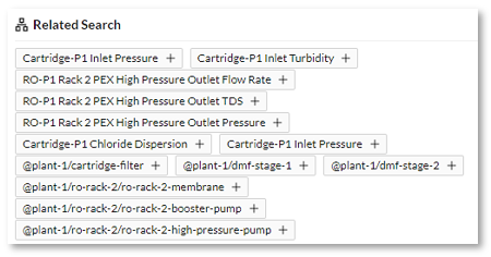 The Related Search automatically updates all affiliated tags with the sensors/KPIs used in the search. This assists the user with related metrics/KPIs to help with the analysis.