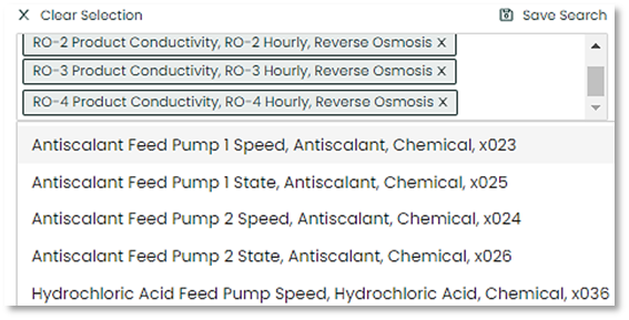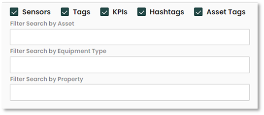 The user can filter the sensors/KPI search in categories including Asset, Equipment Type and/or Property. This will selectively only add the related tags in the search option and help narrow down what you are looking for. Also using the check boxes, you can select what to include or omit from the search.