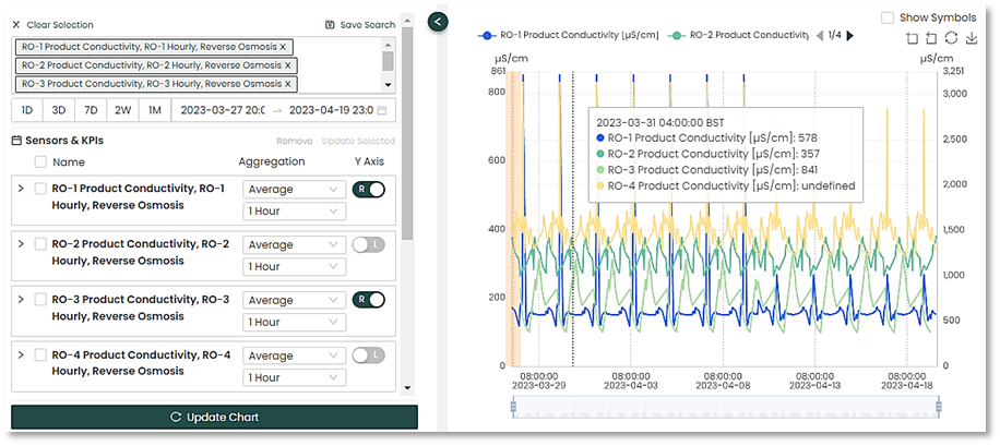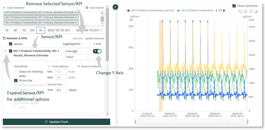 This section allows the user to see what sensors and KPIs will included on the interactive graph and gives the option of choosing different y-axis per sensor.