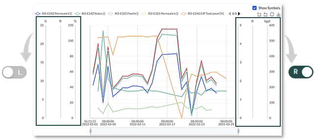 The Y-Axis labelled sliders indicate which side of the graph a KPI’s Y-axis scale will appear. In this example some of the graph scales are stacked on the left , while others are stacked on the right side of the graph window.