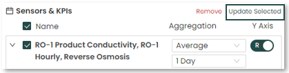 Clicking the “Updated Selected” reveals the Aggregation Settings box where you can choose the settings for multiple selected Sensors & KPIs instead of individually.