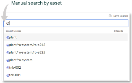 - Asset search – typing the @ symbol into the search box will bring up a list of assets to search.